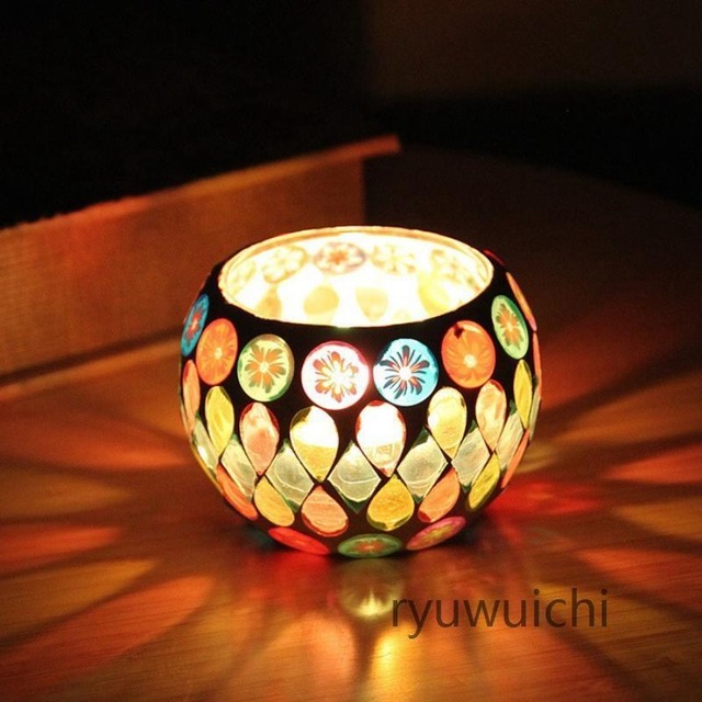 キャンドルは別売りになります ステンドグラスを思わせるようなとっても素敵なキャンドルホルダーです デザインや色合いもとても美しく、コロンとした形もかわいいですね クリスマスやホームパーティー、普段使いにいかがでしょうか また、植物を入れたり小物入れとしてもお使いいただけます ゆらゆらと柔らかい光で照らしてくれるキャンドルは、特別なキャンドルホルダーで灯すことによって、ガラスを透過する影や模様も癒やしの空間へと誘い、ステンドグラスからこぼれる光で空間を幻想的に包みます 暗い中で優しく美しい光を灯してくれるかわいいオススメアイテムです 素敵なキャンドルホルダーは、素敵な暮らしに欠かせないアイテムと言っても、決して過言では無いのかもしれません